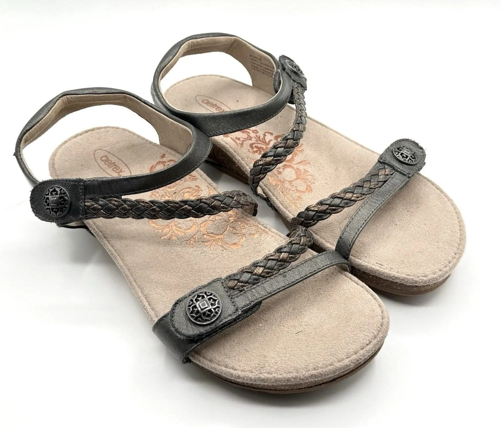 The Aetrex "Jillian" Gray Braided Leather Strappy Sandal in women's size 11 offers comfort and style... Show more