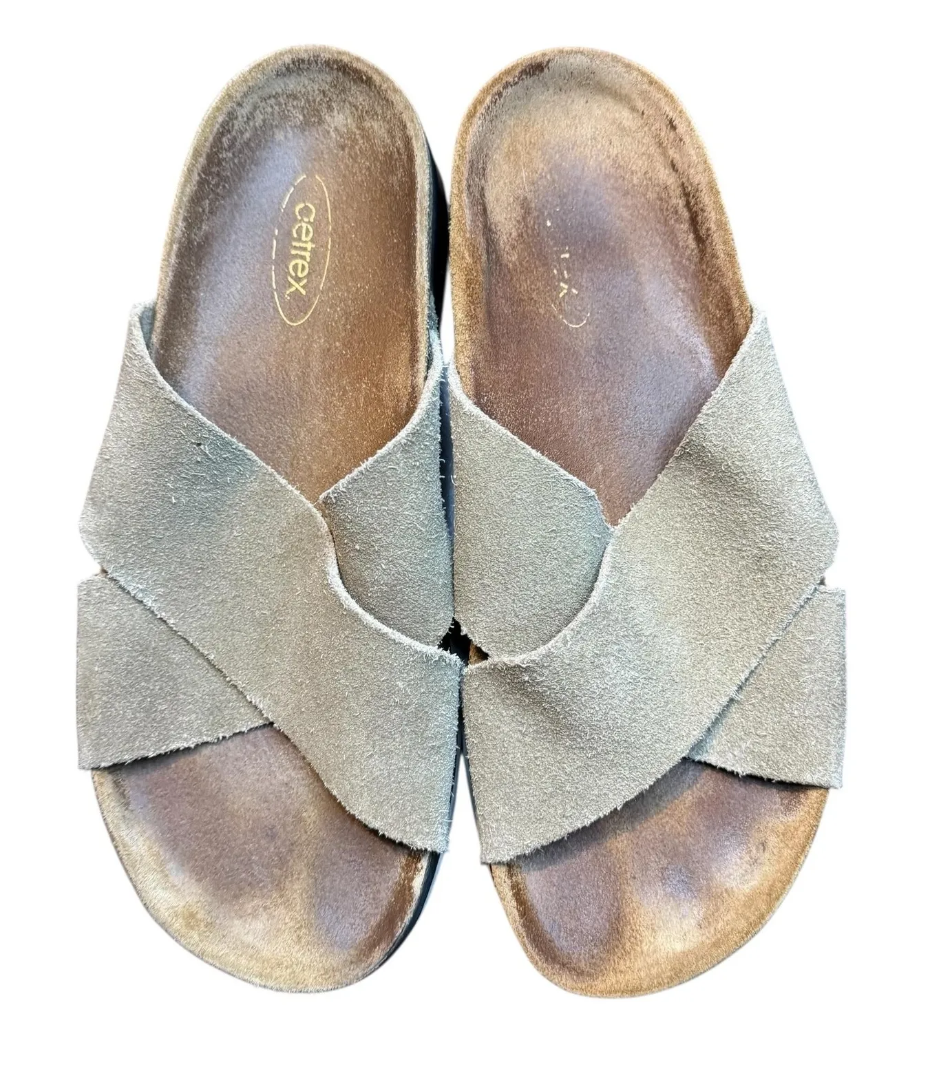 Brand: Aetrex Style: Womens slip-on slide sandals with wide crisscross suede straps and contoured footbed. Color: Taupe / light beige suede upper with brown footbed and white outsole. Size on tag: EU 37 / USA 7 / UK 5. Materials: Genuine leather upper; cork-style midsole with cushioned footbed; synthetic outsole (per interior stamp). Made in China. Design details: Open toe, slip-on construction, cross-strap design, molded comfort footbed, platform-style midsole and textured wave-grip rubber outsole for traction.