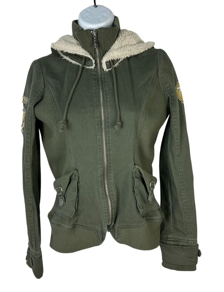 This military-inspired jacket combines functionality with style, featuring durable cotton material and embroidered patches, ideal for a polished casual look. • Full zip closure for easy wear • Two front pockets with snap closures • Ribbed hem and cuffs for a snug fit • Embroidered sleeve patches • Sherpa-lined hood for added warmth Light wear on fabric with slight fading; no major flaws detected. Size: Womens XS These are the Approximate Flat Lay Measurements Pit2PIt 17 in / 43 cm Hem: 15 in / 38 cm Length: 22 in / 56 cm Sleeve: 24 in / 61 cm Shoulder: 13 in / 33 cm Condition: Pre-Owned Like New This item has been previously worn, however, it’s in excellent condition. A8759 Enjoy fast shipping and epic customer service! Offers are accepted. Bundle and save!!! If you have any questions let me know! Smoke Free, Pet Friendly Home