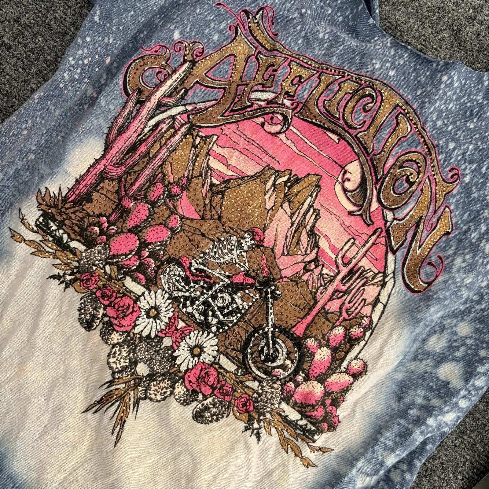 The Affliction Women's "Skeleton Valley" scoop neck rhinestone T-Shirt in size L is a stylish and trendy piece perfect for casual occasions. This Y2K style top features a bleach wash pattern, short sleeves, and a pullover closure. The shirt is adorned with rhinestones accents, giving it a touch of glamour. Made of 100% cotton, this breathable garment is suitable for all seasons and has a regular fit. Its design incorporates elements of heart, art, biker, punk, and rock themes, making it a versatile addition to any wardrobe.