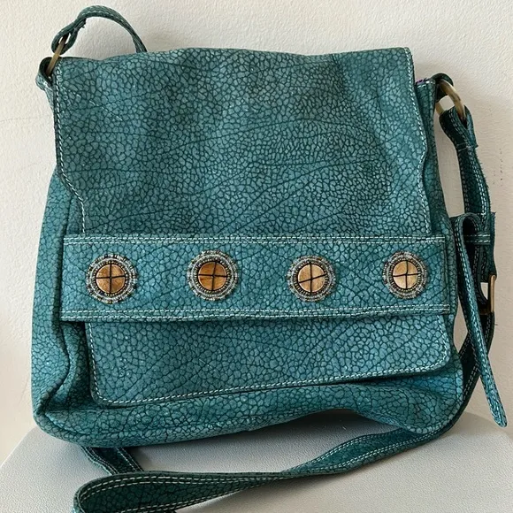 Gorgeous teal suede back with African motif interior pattern. Crossbody strap. Genuine suede exterio... Show more