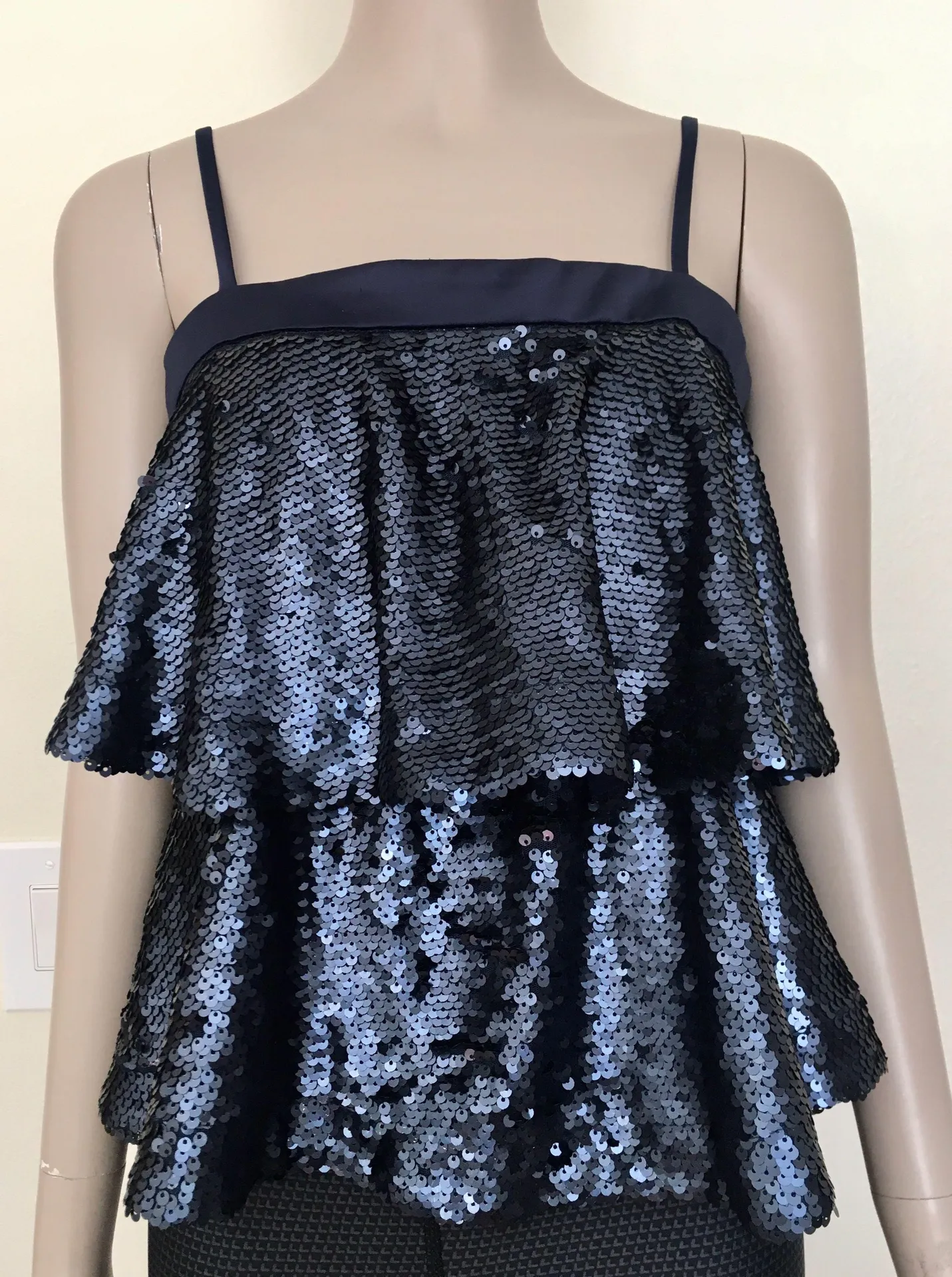 EUC! Navy blue, After Market sequin tier top with adjustable straps. Top satin trim accent. Back hid... Show more