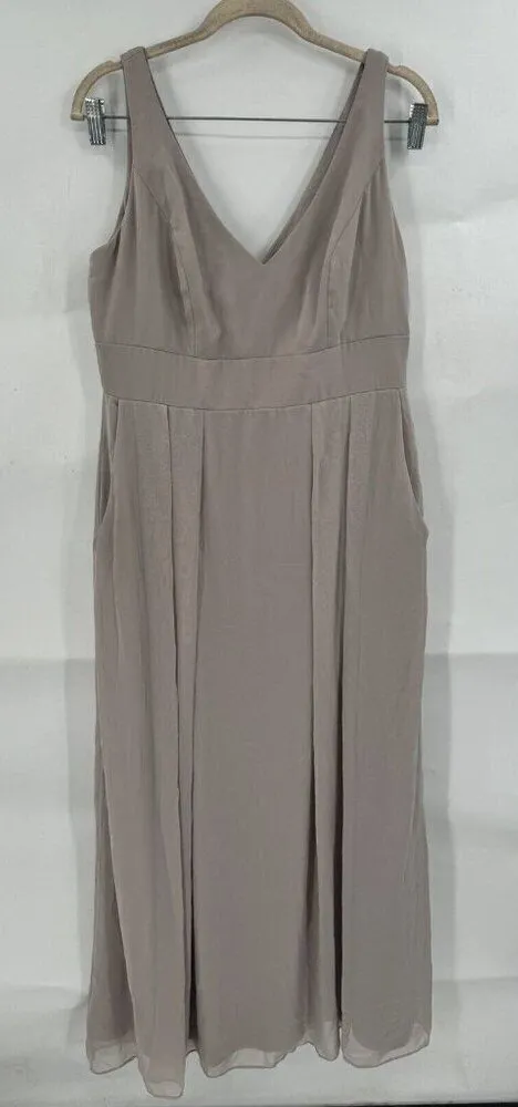 Good pre owned condition, has been altered so please see measurements below. Has a stain along the back , see photo. Has a small stain on the chest near neckline, see photo, light and hard to see. Zip back closure. Size 12. Sleeveless. Taupe colorway. Has pockets. All measurements are approximate: 38 inch chest, 19 inches pit to pit laying flat. 32 inch waist. 55 inch length from shoulder to bottom hem.
