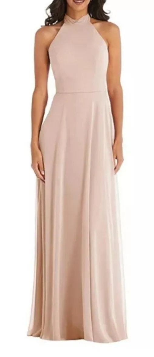 After Six Dessy Collection High Neck Halter Backless Maxi Dress Cameo Tan Beige Pink Undertone 1545... Show more