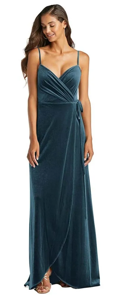 Lux velvet maxi wrap dress with soft pleated detail at bodice and skirt. Ballet back on bodice. Pockets in modified circle skirt. pockets Size XL Pleated detailing Side pockets allow for easy wear 100% polyester Dry clean No flaws Length: 57” Brand new with tags Perfect for prom, bridesmaid, wedding, wedding guest cocktail party, or special occasion
