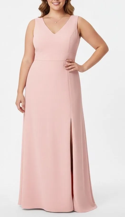 A blush pink formal gown by After Six. This sleeveless dress features a flattering V-neckline and a high slit on the skirt for elegant movement. The fitted waist accentuates the silhouette, flowing into a floor-length hem. Perfect for weddings, galas, or formal evening events. Measurements: • Chest: 26 in • Length: 60 in • Waist: 28 in Material: Polyester Sleeve Style: Sleeveless Country of Origin: Thailand Keywords: after six, formal gown, blush pink dress, bridesmaid dress, prom dress, evening wear, formal occasion, sleeveless gown, v-neck dress, high slit dress, plus size formal, elegant dress, party dress, special occasion All orders are shipped the same business day or the next business day. Thank you for supporting my small business.
