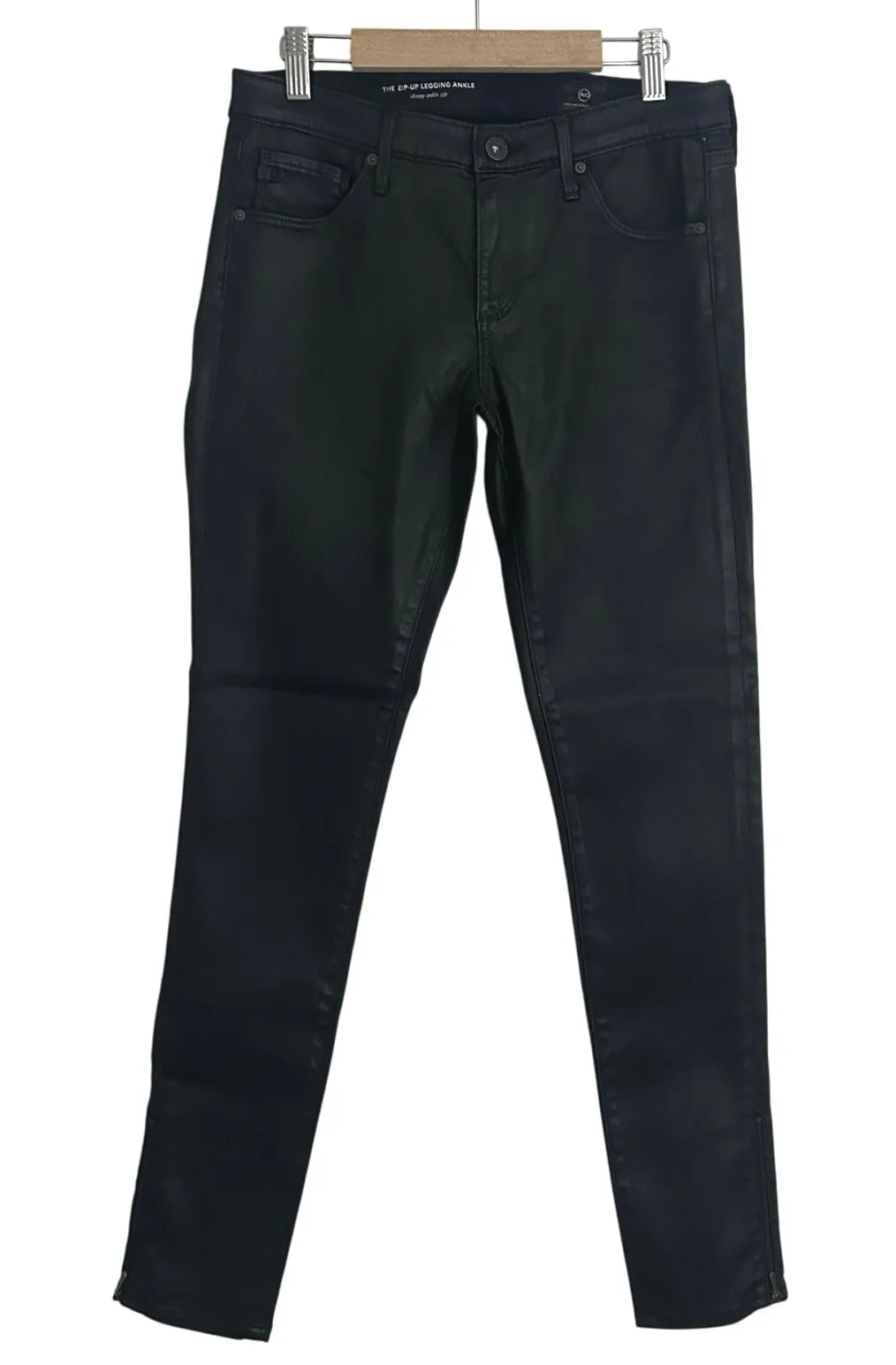 Features: Skinny leg opening, button/zipper closure, belt loops, 5-pocket design, coated/waxed finish, black, zipper at the ankle