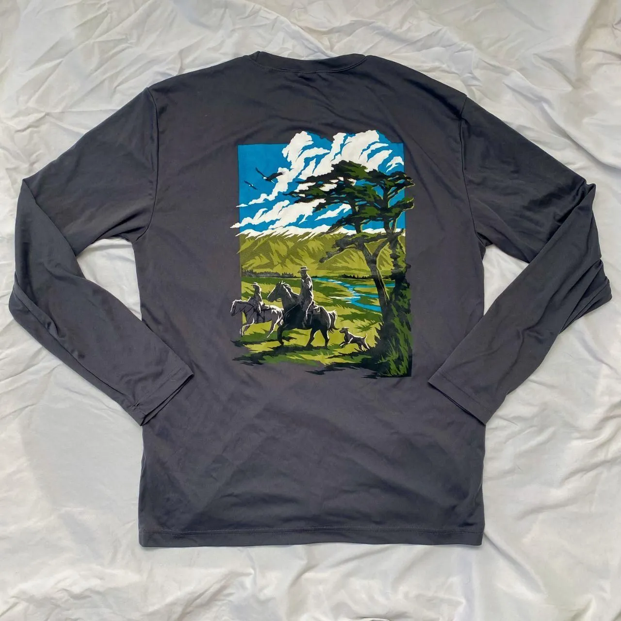 Western Sport Tek Long Sleeve ༓ Brand: AGAMERICA ༓ Size: M ༓ dark gray sports long sleeve, print is on BACK of shirt ༓ cowboy on horses with dog graphic print Measurements: ༓ pits 20" ༓ length 263" Tags: #boho #western #cowgirl #cowboy #lumberjack