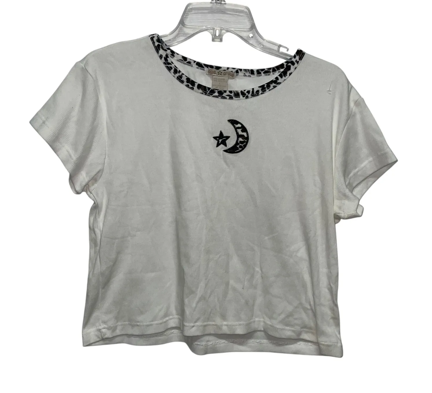 Age Group cropped t-shirt in white with a celestial moon and star graphic on the chest. Features a distinctive leopard print trim along the neckline for added flair. Short sleeves and a relaxed fit make this a comfortable and stylish addition to any casual wardrobe. Keywords: Age Group, cropped, tshirt, graphic tee, moon, star, leopard print, celestial, casual, feminine, trendy, summer top, short sleeve, comfortable