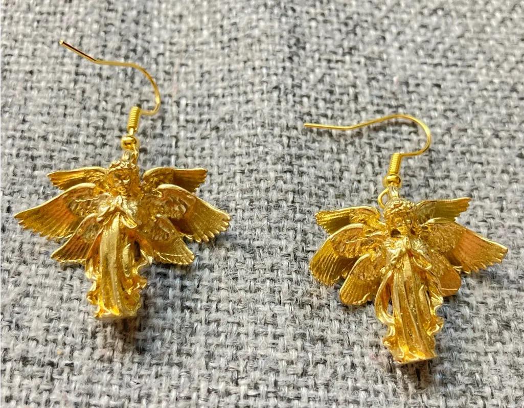 Aged Gold Angel Earrings Vintage Look Six Wings Baroque Style Dangle new • Elegant vintage-style angel earrings • Antique gold-tone with six detailed wings • Size approx. 1.75” long (4.5 cm), measured with hook • Elegant statement for gothic, baroque, or old-world styles