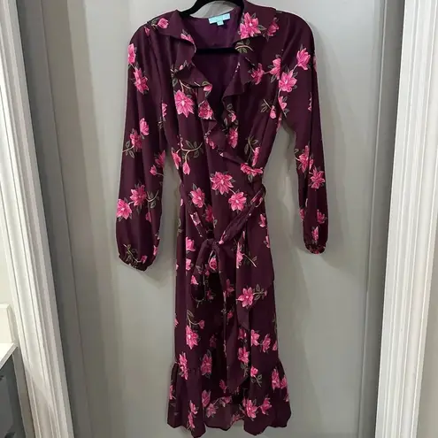 Excellent Condition Draper James RSVP Long Sleeve Ruffle Wrap Floral Midi Dress Plum Purple Si... Show more