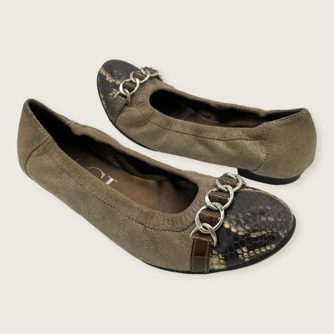 Attilio Giusti Leombruni AGL Shimmer Tan Brown Suede Leather Woven Chain Detail Snakeskin Cap Toe Ballet Flat. Made in Italy. Size 35.5 or 5.5 as per AGL's size chart. Elasticated topline. Number inside are N55A28. Excellent used condition.