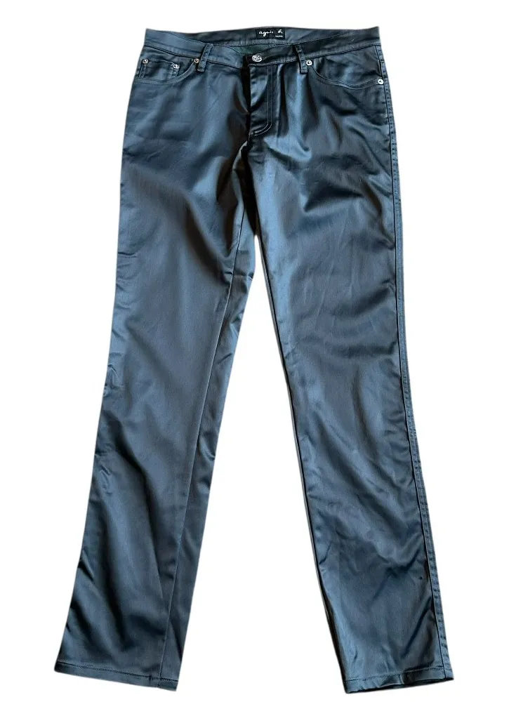 Agnes B. Size 40 Eu / Size 8 Women's US Skinny leg pants in gorgeous deep blue satin fabric Front and back pockets; Button closure at waist with zip These pants are great dressed up or down, great for transition from day to night, cocktail, party, festival, special occasion, school, club 59% acetate/36% polyester/5% lycra Measurements taken across the front when laying flat: Waist: 16", Rise: 9", Inseam: 30.5" In excellent condition; no stains, holes or flaws I am always open to offers - bundle & save!