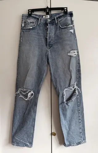 Keywords: AGOLDE jeans, 90s Jean, Distressed jeans, Ripped jeans, Blue denim, Organic cotton jeans, Button fly jeans, Women's jeans, High rise jeans, Light wash denim, Fashion jeans, Casual jeans, Street style, Designer denim, AGOLDE Los Angeles