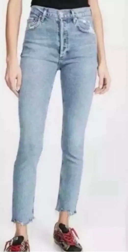 A pair of organic cotton blend jeans from Agolde. Raw hem. Button fly. Size 26.