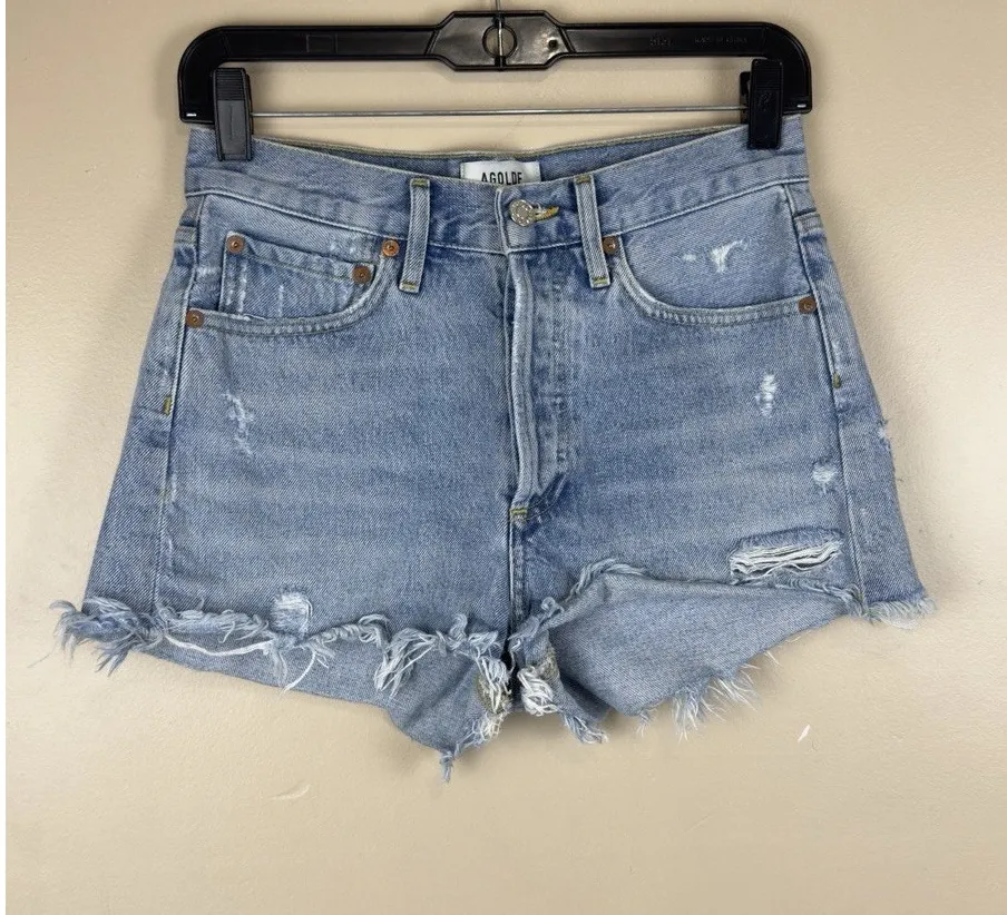 Agolde Parker women’s distressed denim shorts, size 24. Blue high-rise cut-off style with button fly... Show more