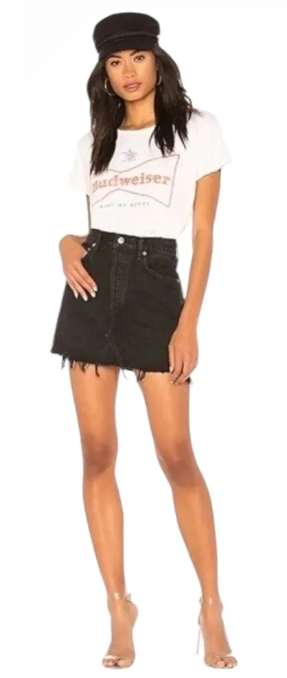 Chic denim skirt with a modern edge. This black denim mini skirt features a high-rise waist, classic five-pocket styling, and a unique button-fly closure. Distressed detailing on the front adds a touch of edgy appeal, while the frayed hem provides a playful, casual finish. A Line Silhouette, button fly, and made with 100% cotton.