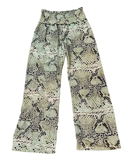 Perfect for lounging by the pool over a swimsuit or for a festival, these wide leg pants from Agua Bendita are slightly sheer with a smocked waist. Minty green snakeskin cobra print. Very good condition, no flaws Pair it with the matching Alegria or Lolita bikini.