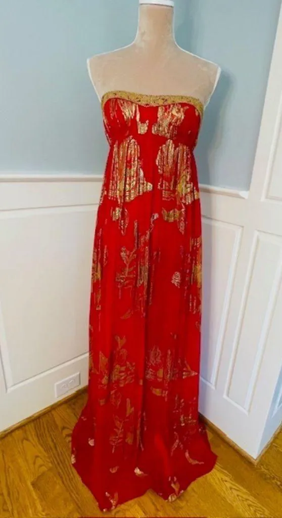 Aidan Mattox Nightline Strapless red & gold metallic beaded gown. Silk blended with metallic gold threads. Fitted strapless bodice with high empire style waist and A-line silhouette. Fully lined in red satin with semi sheer silk overlay. Built in corset style bra fastener. Stunning and sophisticated vibrant evening dress/gown, stunning beaded maxi dress. Size 4 (listed as XS best fits 0-2 due to bust size) Flat Measurements Are Approx: 15.5" Pit to Pit 57" Length Shown on a 34-26-36 Form (would not zip at bust see photos) Condition: Very good pre-owned, worn once, has normal loose metallic threads and one minor pull at zip that doesn't show as it is in the fold of the zip. Prom Special Event Ball Cruise Gown Formal Glam Sexy Glam Red & Gold Metallic Wedding Dress Elegant Sophisticated Pretty Stunning Gorgeous Shimmer Sparkly Beautiful