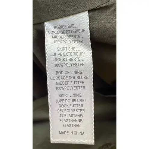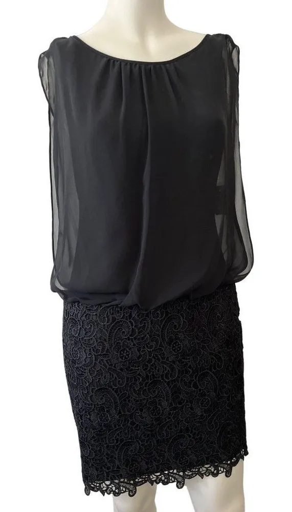 Chiffon top with crochet lace bottom cocktail dress button and loop closure at the back of the neck Fully lined top Wide sleeveless style Fitted bottom skirt sleeveless 100 percent Polyester bodice 100 percent polyester bodice shell 100 percent Polyester skirt and lining Size: 2 Measurements: Bust 15 in Waist 16 in Length 33 in cocktailparty partydress littleblackdress homeentertaining churchparty modest