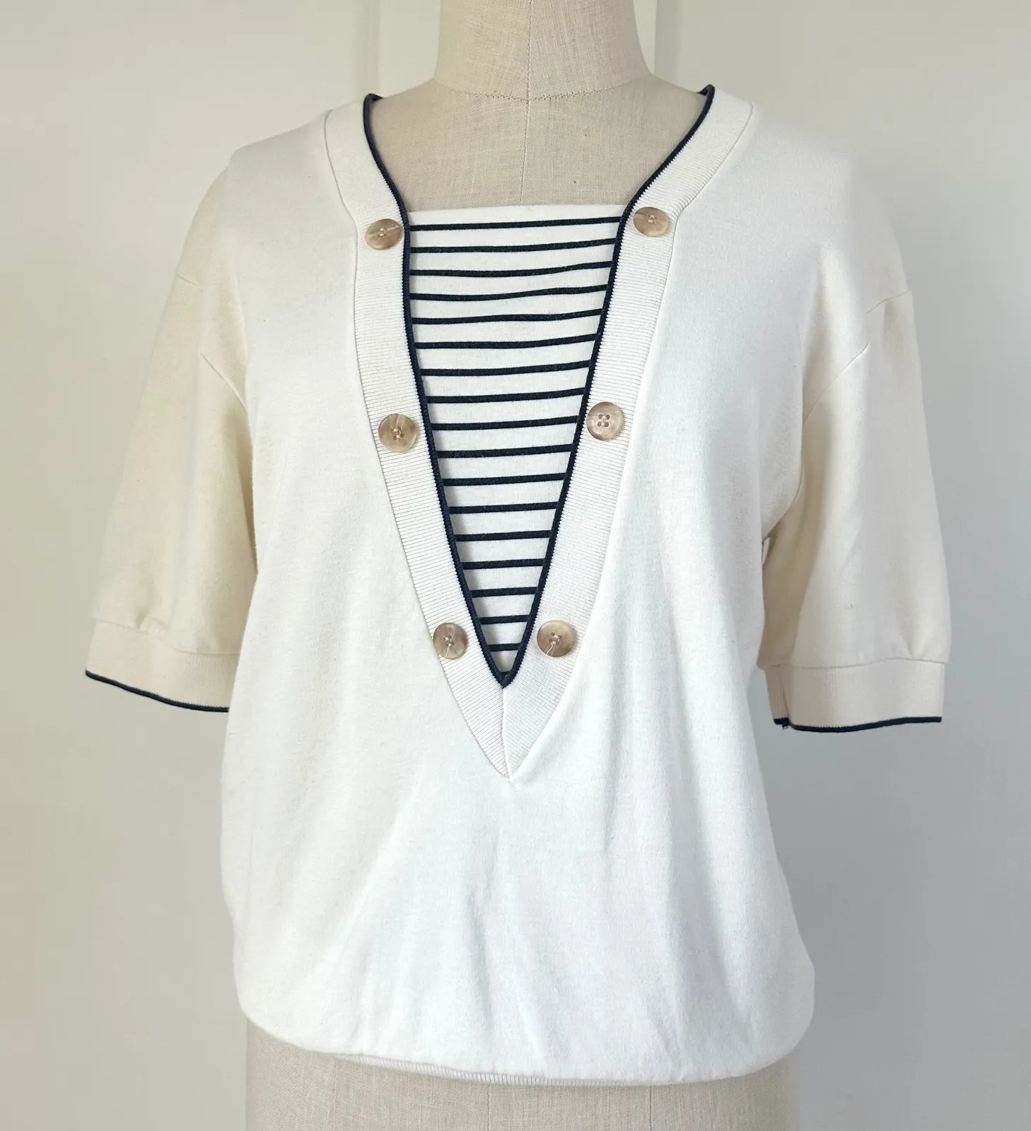 Conjure up a nautical daydream with this preppy Aileen Petites top. A classic cream canvas meets bold black stripes and refined navy trim, creating a piece that's both timeless and fresh. The unique button-front V-neck design adds a touch of sophistication, while the soft knit fabric ensures all-day comfort. Imagine yourself strolling along the boardwalk, enjoying a seaside brunch, or simply adding a touch of nautical flair to your everyday style. Measurements: • Pit to pit: 17 inches • Length: 24 inches Color: Ivory Type: T-Shirt Department: Women Style: Basic Material: Knit, Cotton Neckline: V-Neck Sleeve Length: Short Sleeve Sleeve Type: Classic/Fitted Sleeve Accents: Button Pattern: Striped Features: Breathable, Lightweight, Coastal Granddaughter, Nautical Fit: Regular Keywords: Aileen Petites, Sailor Top, Striped Top, Nautical Top, Button Top, Cream Top, Black Top, Short Sleeve Top, Casual Top, Cute Top, XS Top, Petite Top, Vintage Top