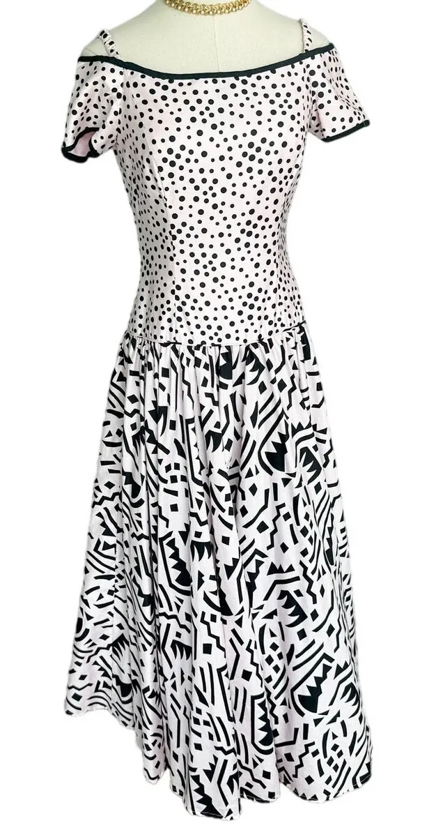 AMAZING A.J. Bari vintage late 80s/early 90s 100% cotton polkadot abstract mixed print off shoulder drop waist party dress with crinoline! Lined, lightly boned bodice with crinoline underskirt. Hidden back zip. 1000% amazing! Measures flat Chest ~17" “Waist” 16 Length 48.5 •Size: 6/small •Condition: Excellent vintage!! Barely worn/like new. Hanging ribbons still intact •Color: pale pink & black Bundle for combined shipping! Pictures/video are part of the description. Measurements are approximate and for guidance. Color may vary by screen. Sizes vary between designers. ALL preowned items can be expected to show normal signs of wear. Smoke free, DOG FRIENDLY home. 10% of net sales go directly to charity at my local food bank. tags: vintage 80s 90s designer classic retro 40s 50s style pinup old hollywood glamour glam party special occasion polka dot