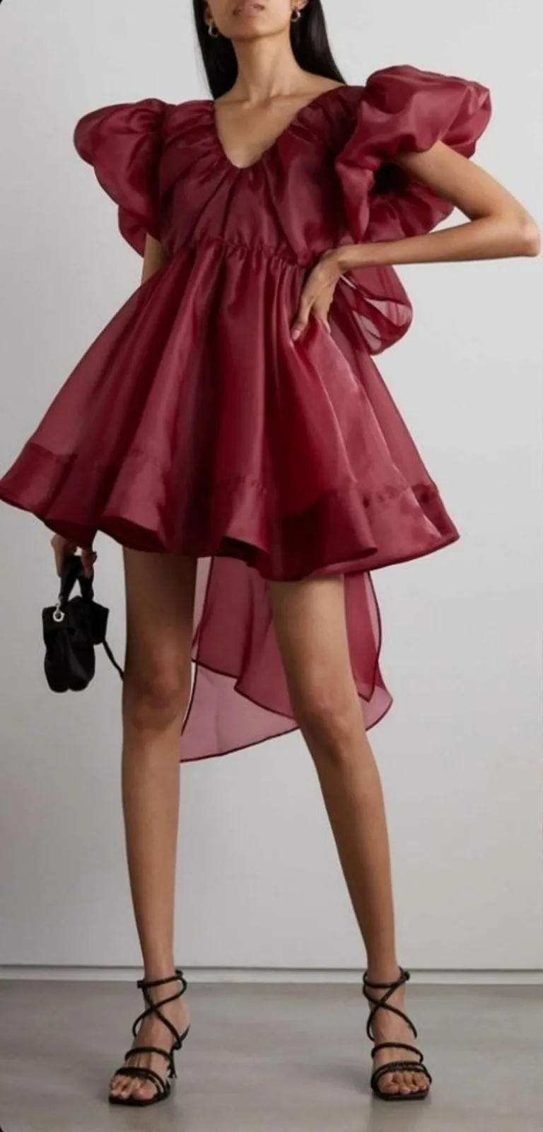 Features:Made from organza in a warm burgundy hue, this 'Gretta' mini dress has short tulip sleeves... Show more
