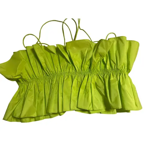 The Jordyn top from AKNVAS flaunts thin strappy detailing and a halter neck. This cropped style is finished with voluminous puffed ruffles for added depth. Halter neck Sleeveless Ruffled Strappy Pulls on Front hook and eye closure Non-slip silicone neck lining Exaggerated ruffle detail throughout Professional dry clean only 100% polyester Made in USA Our Style No. AKNF-WS25 Manufacturer Style No. S23-5009-ACI Color: Acid MSRP: $425.00 Size: Womens 4 Measurements taken flat across, Bust 15 in Length 18 in Waist 13 in Condition: New Without Tags Tags: farfetch, night out, party, event, date night, sexy, bodycon, graduation, mini, cocktail, going out, bright colorful, fancy, wedding guest, sheath, brunch, bachelorette, simone, rush, sorority, designer, luxury, high end, runway
