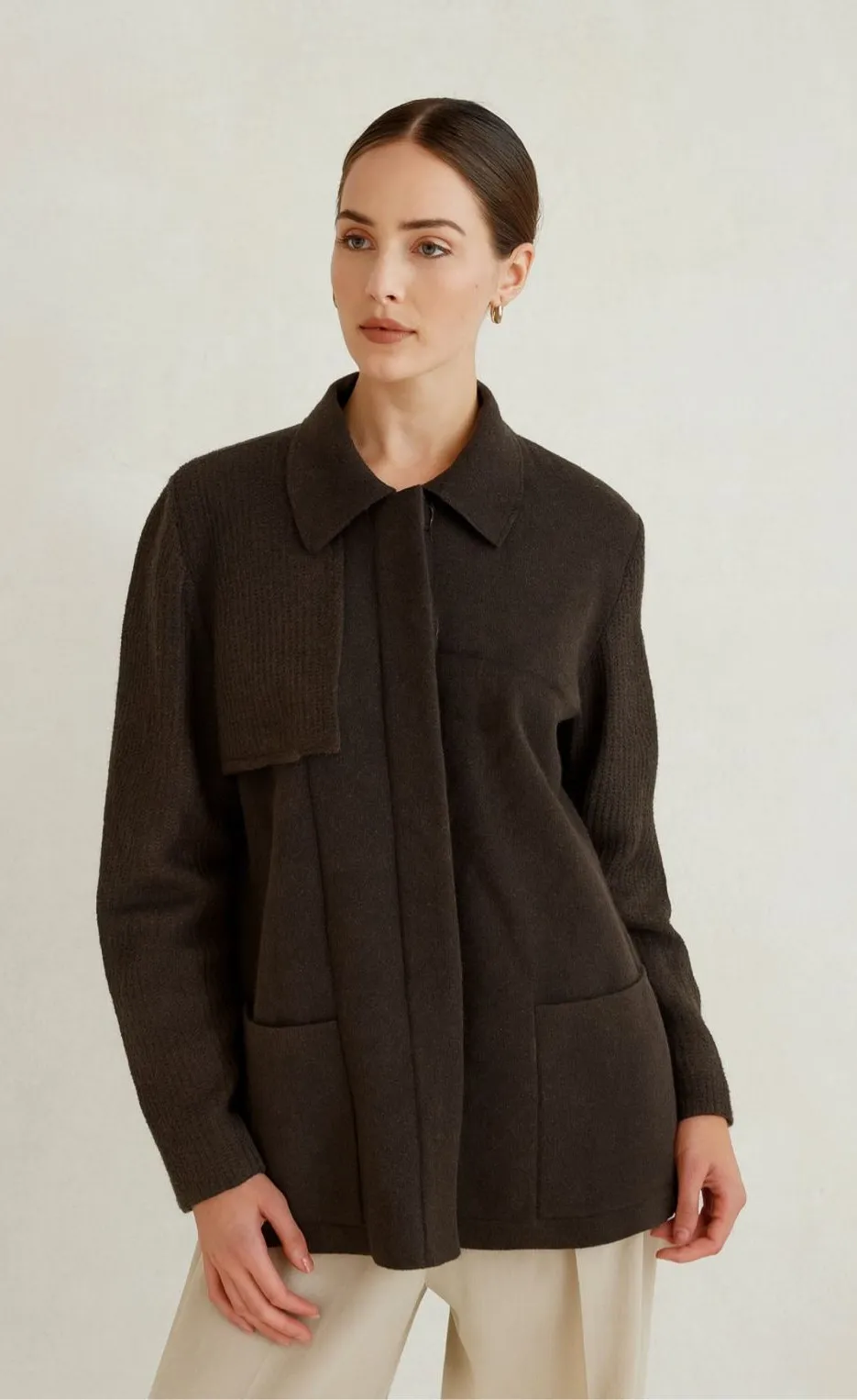Exuding understated elegance, this AKRIS chocolate brown cardigan blends cashmere and angora for a rich, luxurious feel. Features a sculptural asymmetrical collar, hidden front button closure, and textural ribbed sleeves with a unique shoulder overlay. A perfect fusion of timeless tailoring and modern quiet luxury. • Size 8 • Chocolate brown • Cashmere-angora blend (super soft & cozy) • Textured ribbed sleeves • Asymmetric shoulder flap detail • Long sleeves, front patch pockets • Hidden button placket • Excellent pre-loved condition Retail $3500 Old money aesthetic, academic layering, capsule wardrobes, fall-to-winter transitions, and classic minimalists. Pairs beautifully with tailored trousers, cream knits, or luxe denim. quiet luxury, legacy brand, preppy, grandpa-core, coastal chic, minimalist, elegant staple, high-end knitwear, soft tailoring, elevated essentials, luxury designer cardigan, timeless wardrobe staple, refined knitwear, cashmere angora blend, investment piece, slow fashion, sustainable luxury, neutral capsule wardrobe, understated elegance, modern European design, high street luxury, runway inspired, luxe layering, transitional outerwear, autumn winter essential, workwear chic, desk to dinner, elevated casual, minimalist capsule closet