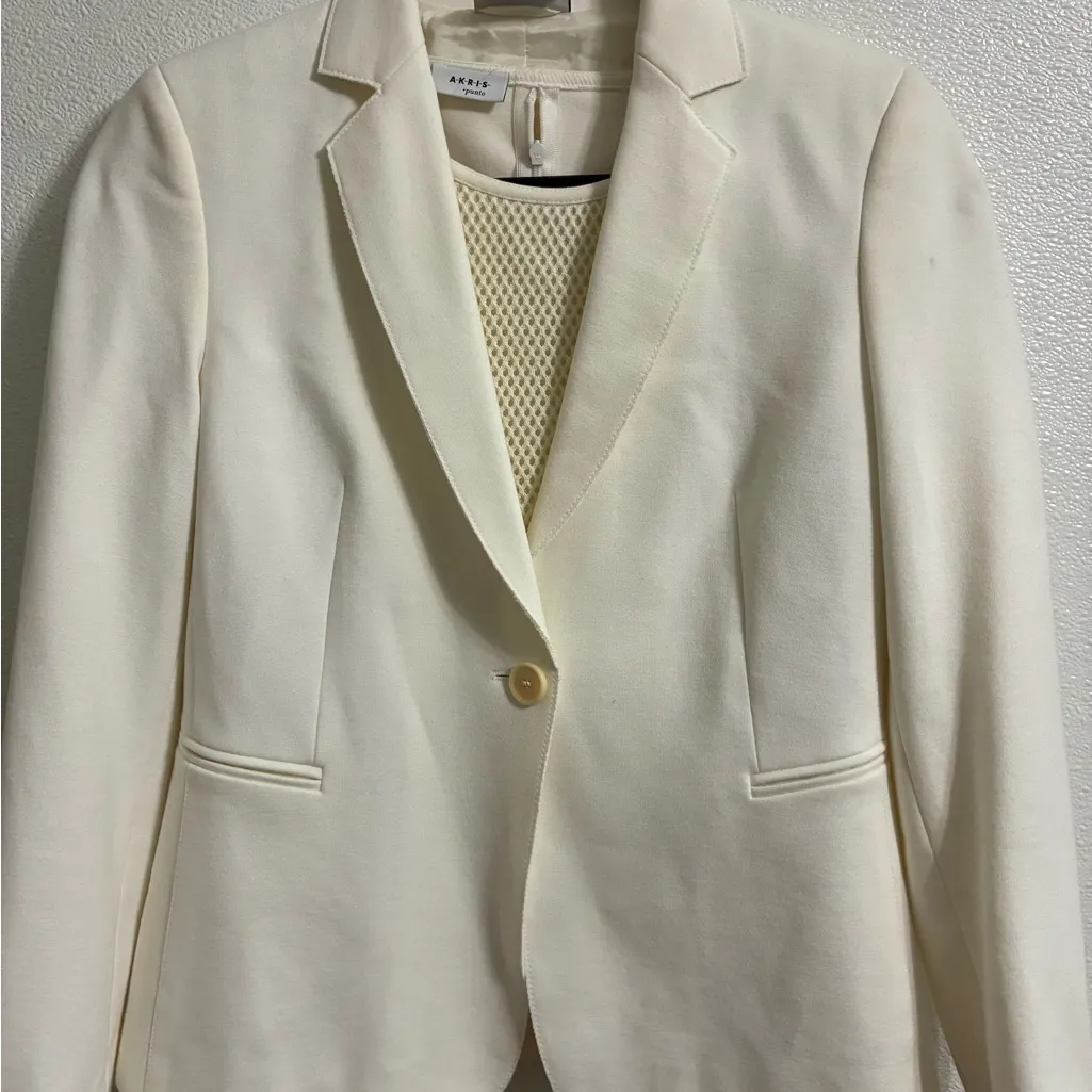 Chic cream pantsuit by Akris Punto. Tailored fit with a classic design. Perfect for professional settings? Cocktail party or a wedding. ( see sizes of each piece below) Jacket (6) one button Length 23” Sleeve 24” Shoulder to shoulder 15 1/2 Pit to pit 18” Tank (8) zip back Length 22” Pit to pit 17” Pants flat front pleated leg (8) Waist 15 2:2 Length 33 1/2 Inseam 26”