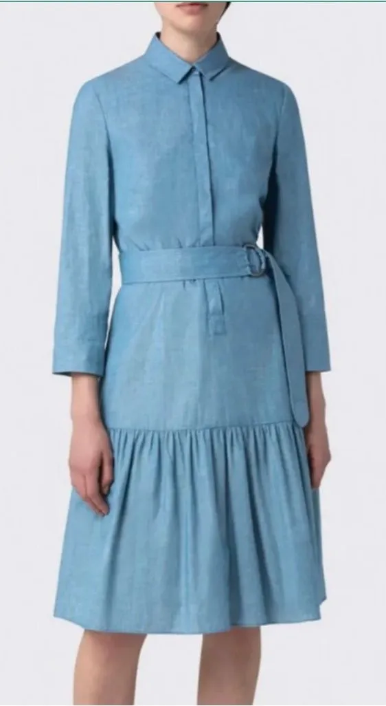 The perfect blend of casual and sophisticated. This dress features a classic collared neckline and a flattering belted waist to accentuate your silhouette. The versatile design makes it suitable for various occasions, from brunch dates to casual Fridays at the office. With its relaxed fit and timeless style, this shirt dress will become a staple in your wardrobe. Dress it up with heels and statement jewelry or keep it casual with sandals for a more laid-back look. Brand: Akris Punto Department: Women's Size: 8 Color: Blue Style: Shirt Dress Closure: Snap Button Neckline: Collared Sleeve Type: Classic Sleeve Length: 3/4 Sleeve Pattern: Solid Material: 100% Cotton Dress Length: Knee Length Condition: Pre-Owned Features: - Adjustable D-ring belt - Chambray fabric - Concealed half snap button front closure - Tiered pleated skirt - All-over solid pattern Approximate Measurements (Lay Flat): Pit to Pit: 20" Waist: 18" Hips: 21" Length: 39.5"