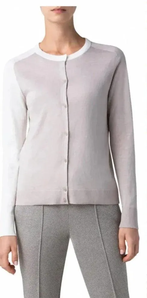 Akris Punto Organic Linen-Blend Contrast Cardigan in Light Taupe & Cream. This organic linen blend cardigan is a classic feminine piece that features a contrasting sleeve detail for a modern finish. Round neck Long sleeve Front button close Rib-knit trim 56% linen & 44% viscose Size US 10 Armpit to armpit is approx 22" Length is approx 25"