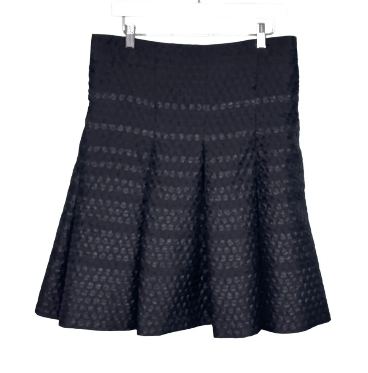 Akris Punto Jacquard Black Pleated Swiss Dot Stripe Skirt zips up the back. The skirt is lined. The Swiss dots are in stripes and some have a sheen. This item has been gently used, and is in excellent condition. Please see photos for condition and approx measurements. Size: 12 Color: Black Condition: Excellent Used Holiday, party, cocktail, evening, out, date, work, business, professional