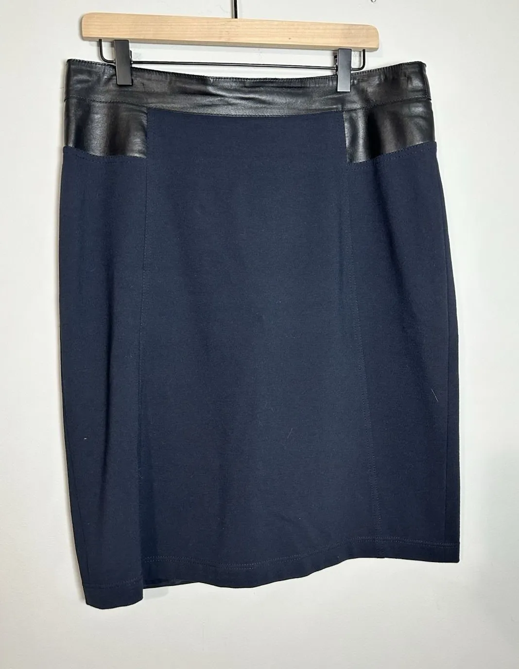 Measurements: Waist 17 Length 25 Known for their "Architectural Fashion," this piece features the brand's signature high-quality Punto knit in a deep navy blue, accented by sleek black faux-leather (techno-leather) trim at the waistband and hips. The curved paneling creates a flattering, structured silhouette. • Style: Tailored Pencil / Straight Skirt • Design: Architectural faux-leather hip detailing for a slimming effect. • Closure: Concealed back zip closure. • Fabric: Premium Italian Punto Knit (69% Viscose, 25% Polyamide, 6% Elastane). Architectural • Minimalist Luxury • Corporate Chic • Mixed Media • Structured • Modern Professional Akris punto, Designer Skirt, Navy Pencil Skirt, Office Wear, Faux Leather Trim, Punto Knit, Size 12 Skirt, Swiss Design, Quiet Luxury, Workwear, Capsule Wardrobe, High-End Sportswear.