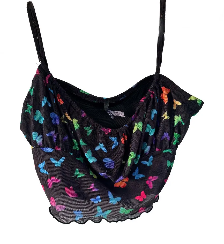 Capture that early-2000s magic with this butterfly-print mesh crop cami from A.Lab. Black semi-sheer mesh base features vibrant multicolor butterflies in shades of pink, blue, green, orange, and purple. Lettuce-edge hem and adjustable straps give it authentic Y2K detailing. Fully lined at the bust for coverage while maintaining that flirty, sheer vibe everywhere else. Perfect for festival season, rave outfits, layering under slip dresses, or styling with low-rise jeans for a nostalgic throwback look. This piece taps into current butterfly trend resurgence and fairycore aesthetics. Brand: A.Lab Size: M Flat Measurements: Bust 33" / Waist 25" / Length 7.5" Material: Mesh (polyester/nylon blend) Condition: Excellent—no holes, stains, snags, or damage. Smoke-free home.