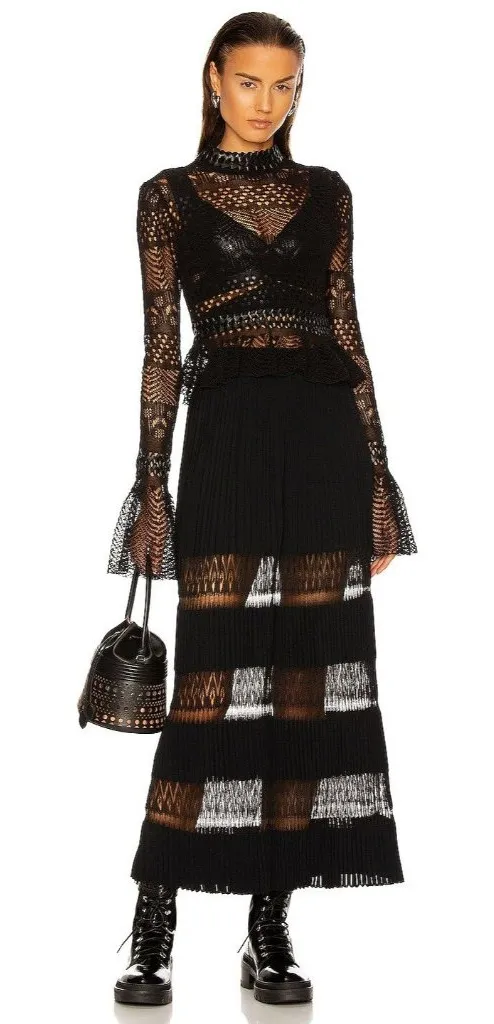 Accordion pleats release generous volume into this pull-on skirt finely knit from a silk-kissed blend, while lace insets reveal subtle glimpses of skin. Sheer lace inserts lend a touch of signature Alaïa allure to this maxi skirt. It's made from black knit fabric with a touch of silk blended in, and is structured with rippling accordion pleats. Elastic waist Hidden side zip closure Pleated detail with lace insets Unlined Dry clean 90% viscose, 6% poly, 4% silk Made in Italy Our Style No. ALIA-WQ8 Manufacturer Style No. AA9J2082TM633 Color: Noir MSRP: $2,600.00 Features: • Totally Sold out on FWRD! Size: Womens 36 Measurements taken flat across, will stretch Hips 16 in / 41 cm Length 39 in / 99 cm Waist 11 in / 28 cm Condition: New With Tags Tags: winter, fall, cream, ivory, off white, neutral, maxi, beach, swim, cover-up, honeymoon, vacay, vacation, party, event, bachelorette, rehearsal dinner, resort, resortwear, birthday, boho, bohemian, trip, revolve, wedding, vacay, vacation, miami, Mykonos, st tropaz, Ibiza, Barcelona, holiday, frwd, bridal, cover up, swim, knit. crochet,