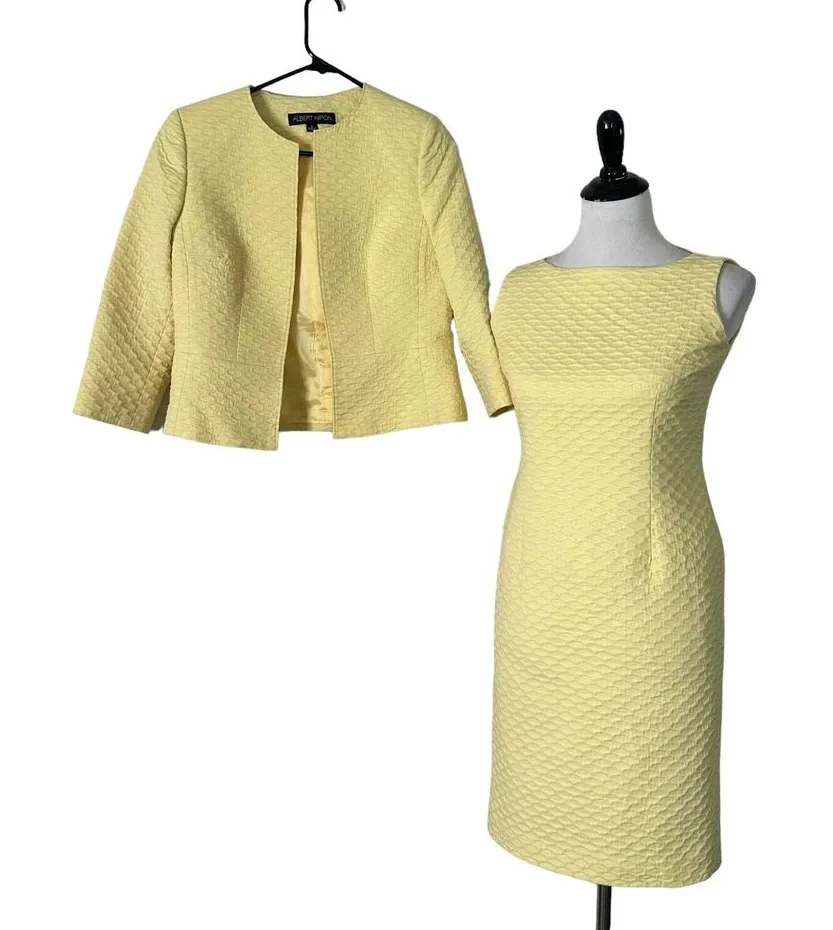 Albert Nipon Textured Dress and Open Front Blazer 2 Piece Set Yellow Women's Size 4 Lined Faint spot at bottom sleeve - Circled in Photos Pre Owned. In Great Shape No Holes or Fading Pet Free Smoke Free