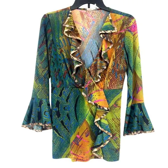 Alberto Makali Abstract Babydoll Ruffle Top with Deep V-Neck and Flare Sleeve Pullover, Silky Feeling to material, Stretchy material Good Pre-owned condition, please see photos Size Small 85% Polyester 15% Spandex Approximate measurements in inches: Pit to pit:17.5 Shoulder to hem: 27 Sleeve length (from underarm): 16 Abstract, Statement, RetroVibe, Ruffle, Maximalist, Silky, Bold, Dressy, Artistic, Y2K, Babydoll, Deep V-Neck, Flare Sleeve, Bold Color, Dressy, Night Out