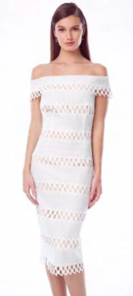 Off the shoulder, has the anti slip rubber on the inside Top has inside boning Back hidden zipper Double lining midi length Back slit No rips No stains EUC Lace, sheer, luxury, holiday, Christmas party, wedding, new years, NYE, Dress bin 3 Item # 75