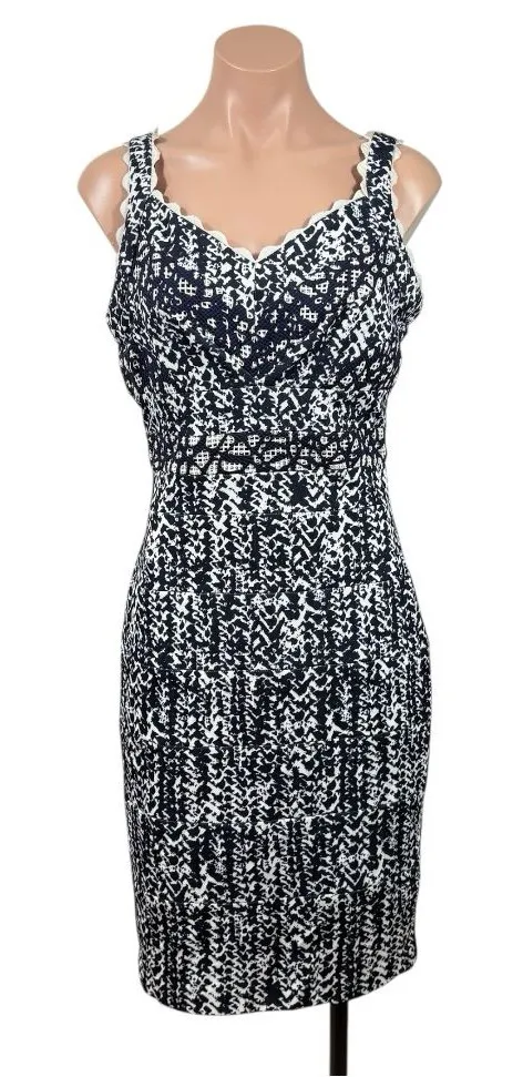 excellent condition- no obvious wear or flaws size womens' MEDIUM measurements in photos dark blue and white printed sleeveless ribbon trim has stretch pencil style skirt versatile dress - wear to work with a blazer jacket or dress down with sandals for a day out! brunch dress .