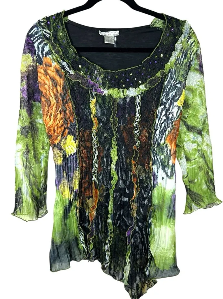 Alberto Makali Y2K Whimsigoth Sheer Moody Witchy Sequin Asymmetric Top Size Medium Outside of shirt in excellent condition. One spot on the inside of the shirt is fraying. Not noticeable while on as seen in photos Approximate Measurements- Length: 26” Underarm To Underarm: 17” Goblincore, witchy vibes, spears, Hilton, ruffles, whimsygoth, 90’s, phoebe buffay, crinkle, abstract, unique, artsy, art to wear