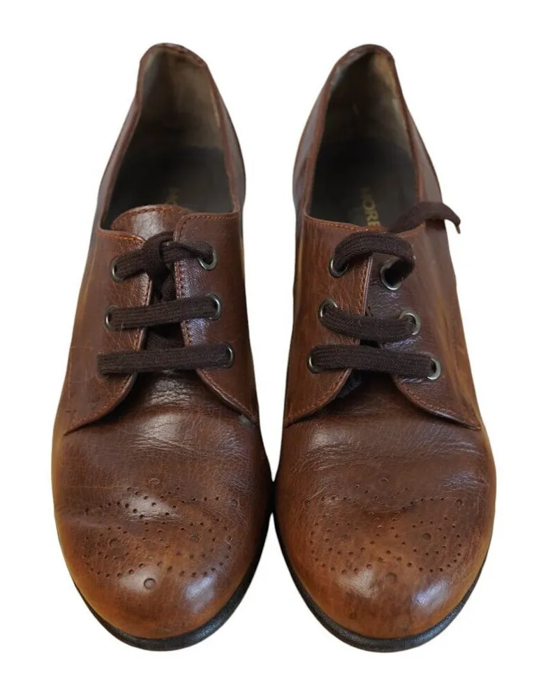Stylish and durable, these Alberto Moretti heeled oxfords offer a blend of elegance and comfort, ideal for professional and casual settings. • Lace-Up Closure • Heel Height: 3 inches • Perforated Design • Durable Rubber Sole • Leather Upper Minor creases and scuffs on heels. Made in Italy.