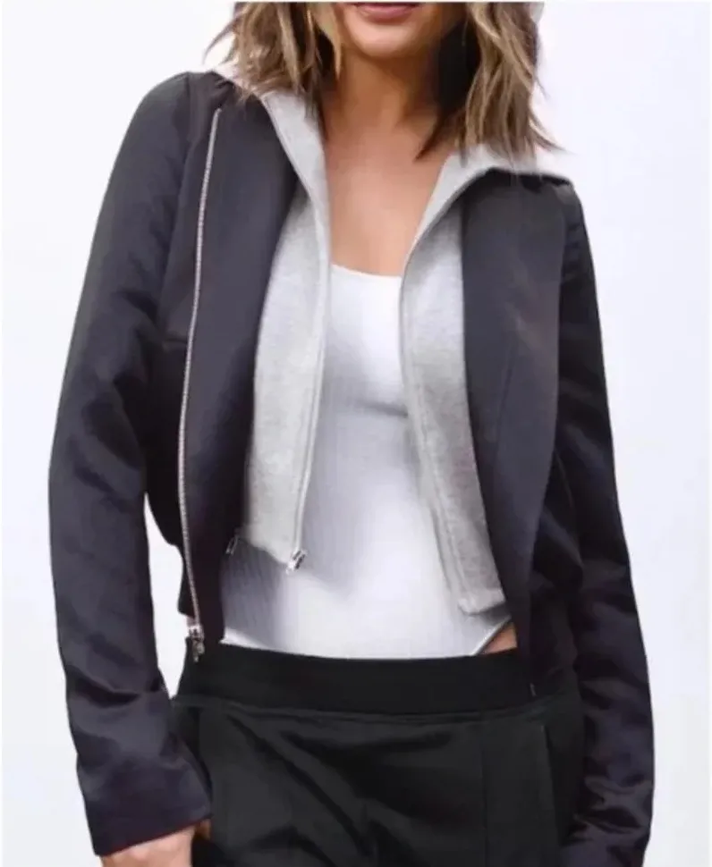 A.L.C. Edison Jacket in Navy Blue This silk bomber jacket in navy blue has a removable grey hoodie... Show more