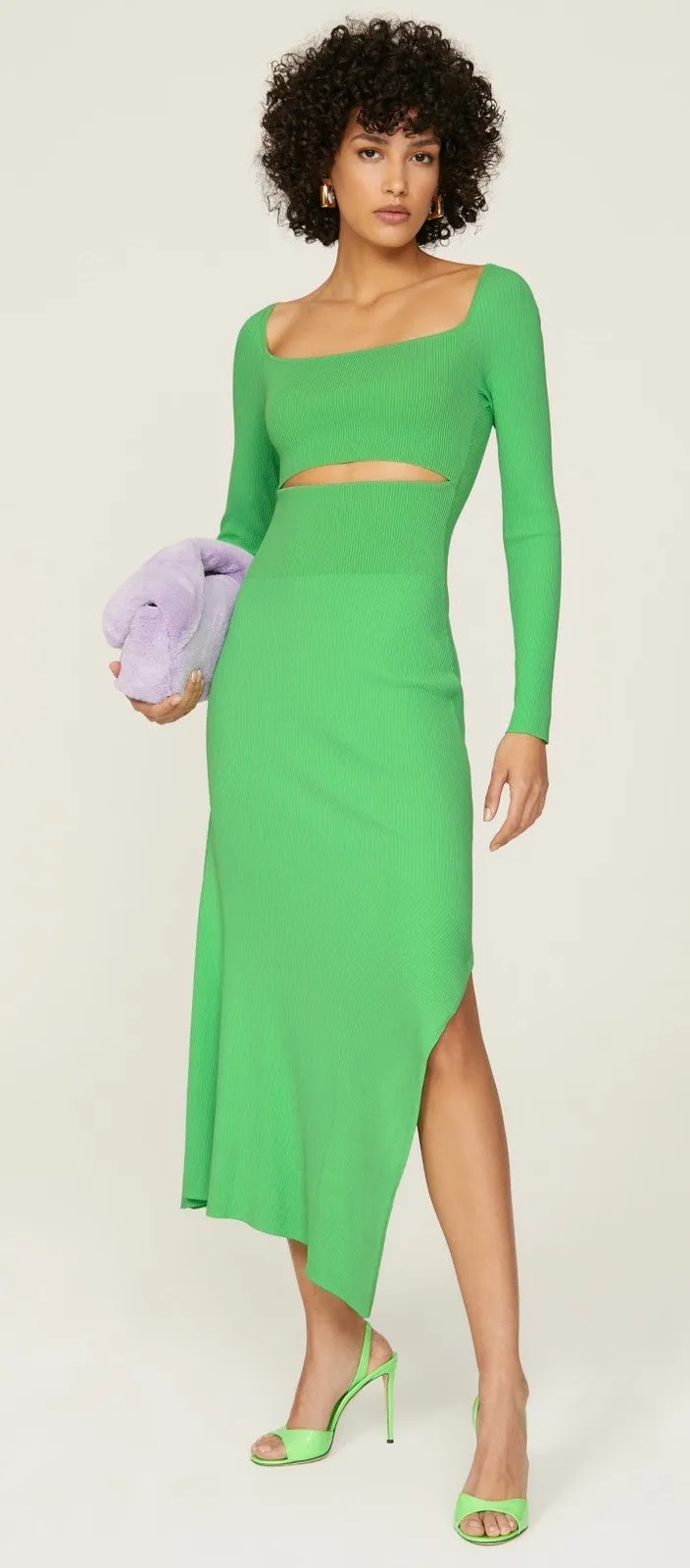 Good preowned condition with a tiny repair at the slit. Size: XS Approximate measurements with garment laying flat: Stretches to approximately 17” bust, 14” waist, 48” length Color: Bright Green Green ribbed knit (77% Viscose, 16% Polyester, 6% Nylon, 1% Elastane) Sheath Long sleeves Square neck Pull on Asymmetrical hem Side slit Midi length Cut out at waist A peek-a-boo midriff and bright green hue lead this head-turning cocktail dress by A.L.C. OFFERS WELCOME BUNDLE & SAVE MORE SAME OR NEXT DAY SHIPPING ITEMS PACKAGED WITH CARE