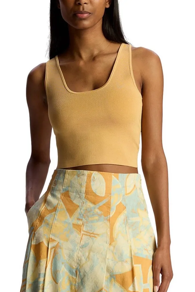 I'm selling an A.L.C. Cleo Compact Knit Top in Blonde Size XL for $100. The Cleo Top is crafted from A.L.C.'s signature compact knit yarn with a slight sheen. This cropped, slim-fit silhouette features a scoop neckline and wide shoulder straps for versatile styling. Styling Tip: Wear yours under a blazer or solo with trousers for minimalist chic. * New with tags * Style: 7SWTP00588 * Not lined * Pull on * 77% Rayon, 21% Nylon, 2% Elastane * Dry Clean Approximate measurements lying flat: * Pit to pit: 16.5" * Length from highest point of shoulder to hem: 18.5"