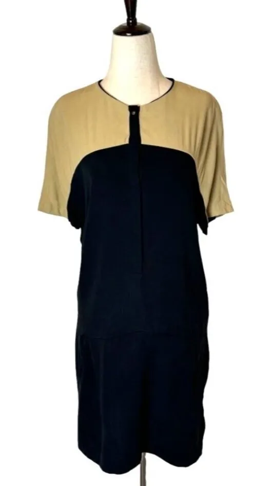 The ALC Dress is a high-end wardrobe staple. This dress features a chic color-block design, constructed from luxurious silk material. Featuring a drop waist, pockets and mini length. Features: • Crew Neckline • Half Snap Front • Short Sleeves • Drop Waist • Pockets • Fall, Winter, Spring, Summer • Colorblock • Dry Clean • Lined • 100% Silk Measurements: armpit to armpit 19.5 in / 50 cm length 34 in / 86 cm Condition: Pre-Owned Great Flaw: There are a couple tiny spots on the back as pictured. designer, luxury, silk, silky, 100% silk, retro, vintage look, Designer, casual, classic, classy, chic, elegant, sophisticated, stylish, trendy, shift, mini, tunic, grannycore, coastal grandma, party, elegant, sophisticated, professional, workwear, business, streetwear, edgy, urban, city, sleek, chic, corpcore, careercore, bossgirl, Size Medium, M, Medium, color-block, colorblock, colorblocked,