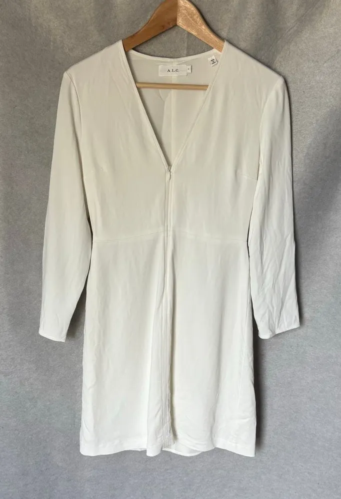 Elegant A.L.C. sheath dress in a refined ivory hue. Features a flattering V-neckline with a sleek front zipper closure and a tailored silhouette that falls above the knee. Timeless minimalist design—perfect for work, events, or elevated everyday wear. 0284