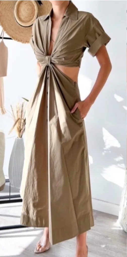 ALC Georgia Cut Out Green Shirtdress Women's size 10 Olive green color Collared neckline Short sleeve Side zipper Side slits on both sides Armpit to armpit 15" Length of top 11" Waist 16" Length of skirt 35" 100% Cotton Tags: Influencer Statement Piece, garden party,bridesmaids, black tie, gala, formal wear, prom, homecoming, garden party, pageant, wedding guest, bridal, wedding, bridal shower, mother of the bride, mother of the groom, rehearsal dinner, bachelorette, pageant, prom, homecoming, wedding, engagement photos, special occasion,sorority,little black dress, gala, Graduation, holiday parties, pageant, Quinceañera, formal, black tie, Indie, Chic,Retro.Minimalist,cocktail, Maid of honor, Special occasion, Designer Event, Dinner gown, Photo shoot, Formal event, Celebrity Red Carpet Luxe Luxury, Holiday, Vacation Resort wear, Beach dress, Spring, Summer, Fall, Winter, Revolve, FWD, Vintage, Anthropologie, Designer