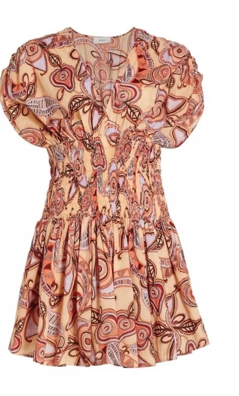 A.L.C. Luna smocked printed mini dress in a peach multi color, made of cotton V-neck Pullover style... Show more