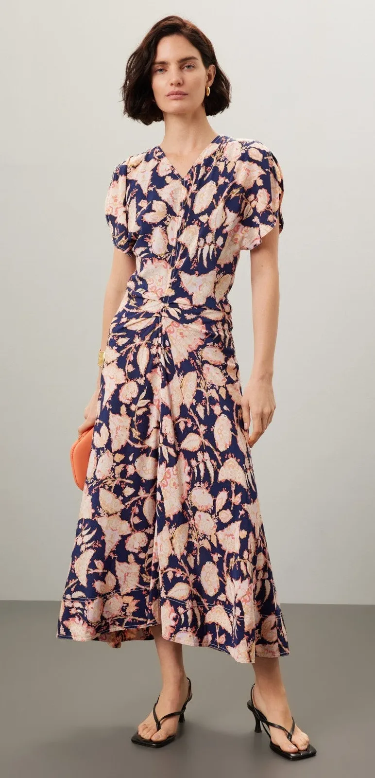 Fair preowned condition. There is color bleeding throughout from the blue so the print is more abstract. Size: 4 Approximate measurements with garment laying flat: 19” bust, 14” waist, 51” length Color: Navy, Pink, Cream Multicolor floral print crepe (92% Silk, 8% Elastane) A-line Short sleeves V-neck Back zipper closure Gathered waist Midi/ankle length Give your work look a fashionable update with this knotted waist shift dress by A.L.C. OFFERS WELCOME BUNDLE & SAVE MORE SAME OR NEXT DAY SHIPPING ITEMS PACKAGED WITH CARE